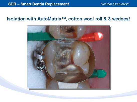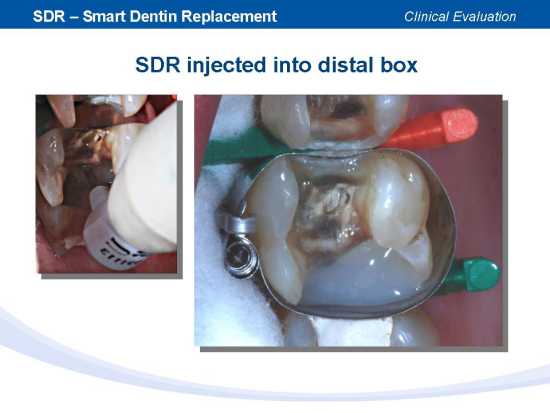 SDR is a flowable bulk filler for posterior teeth from Dentsply. It allows light penetration for curing up to 4mm at a time. Polymerisation shrinkage is 3.5%, comparable to other flowables, but less than many hybrid composites. Dentsply claim that the marginal stress caused by polymerisation shrinkage is around 1.5 MPa - substantially less than other composites, so the chance of marginal leakage is greatly reduced.